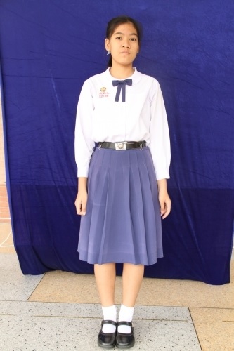 - กระโปรง- กระโปรงสีกรมท่า ยาวคลุมเข่า จีบข้างละ 3 จีบ